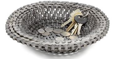 Feita com correntes de bicicleta recicladas, essa tigela pode servir para guardar chaves, moedas e outros objetos...é uma ótima opção para presentear quem ama bicicletas.